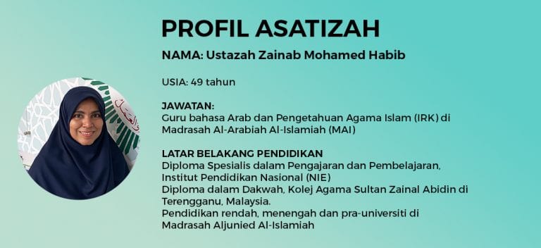 Berkongsi pengalamannya mengajar di Madrasah Al-Arabiah Al-Islamiah (MAI) selama lebih dua dekad, Ustazah Zainab Mohamed Habib, 49 tahun, berkata antara sokongan yang diterima dari Muis termasuk pembiayaan bagi program diploma pendidikan Institut Pendidikan Nasional (NIE) yang disertainya beberapa tahun lalu.