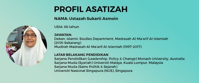 Armed with an education from the National University of Singapore (NUS) in history and political science, Ustazah Sukarti then continued her studies in sharia law at the University of Malaya.